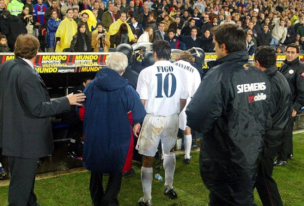 Trận đấu phải tạm dừng đến 16 phút. Bánh mì kẹp trong giấy bạc. Được đưa vào làm 'quà' cho Figo. Anh cúi xuống nhặt lấy một chai nước ngọt. Nhưng lần này không thế". Và một tuần sau đó. Ở một quả phạt góc khác phía bên kia sân. Biểu ngữ được treo quanh sân vận động.